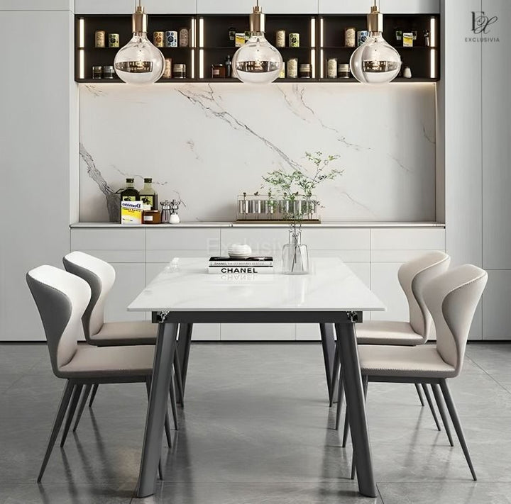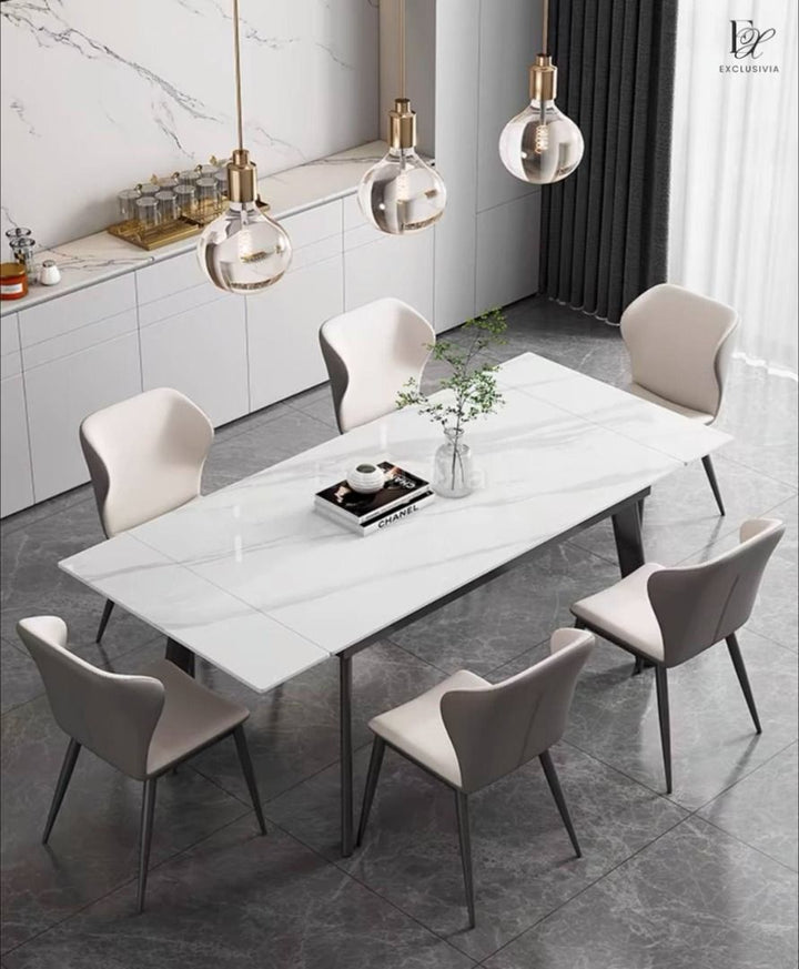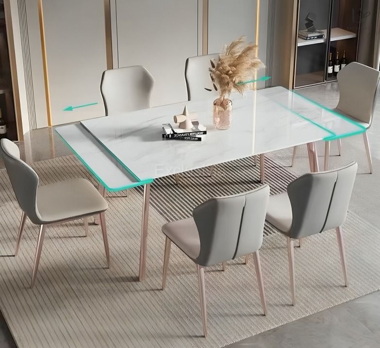 Expertly crafted with modern design, the ELENI Extendable Dining Table is made of durable sintered stone. This material offers superior strength and resistance to scratches, stains, and heat, ensuring long-lasting beauty for your dining space. Transform your meals into a luxurious experience with this sleek and elegant table.