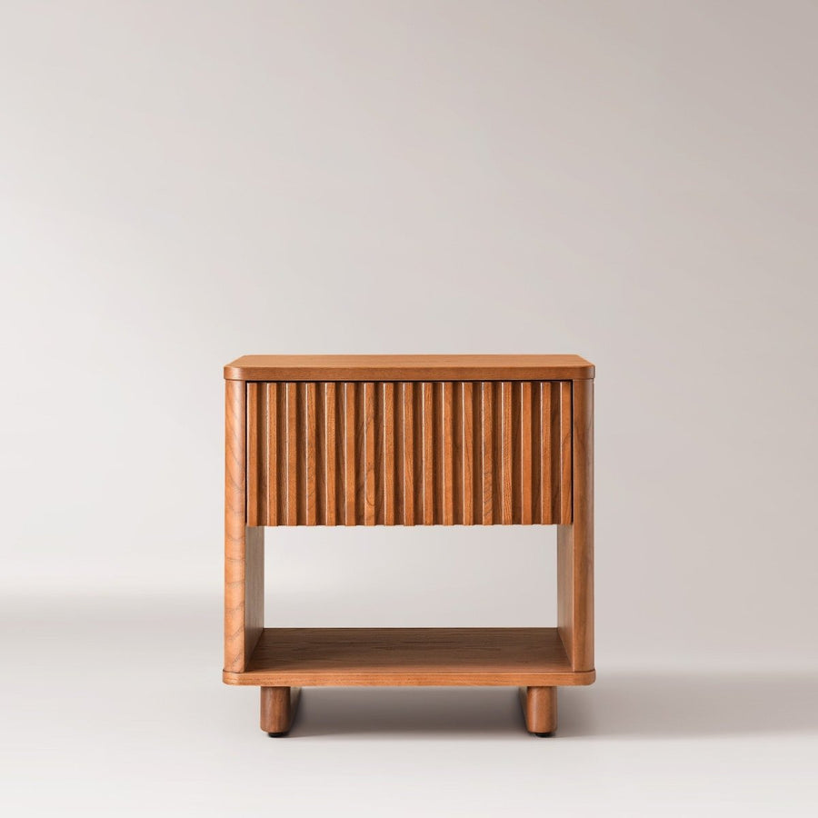 A compact statement of form and function. Liora’s signature square fluting and rich Pine wood tones bring quiet sophistication to your bedside. With an open cubby and soft-close drawer, it offers convenient storage while maintaining a seamless, sculpted silhouette.
