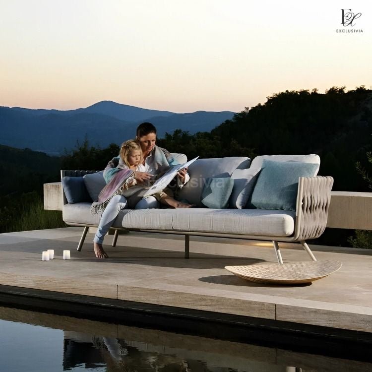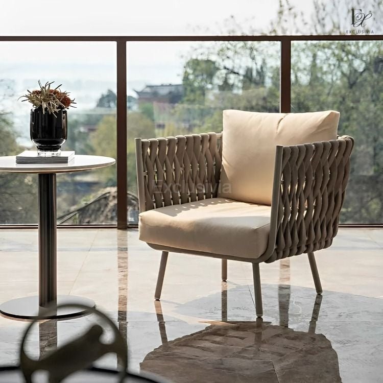 The Indoor Outdoor Chair is the perfect blend of comfort and durability. Handwoven with high-quality textilene rope and supported by a sturdy aluminium frame, this chair can withstand both indoor and outdoor environments. The grey cushion adds an extra layer of coziness for ultimate relaxation.