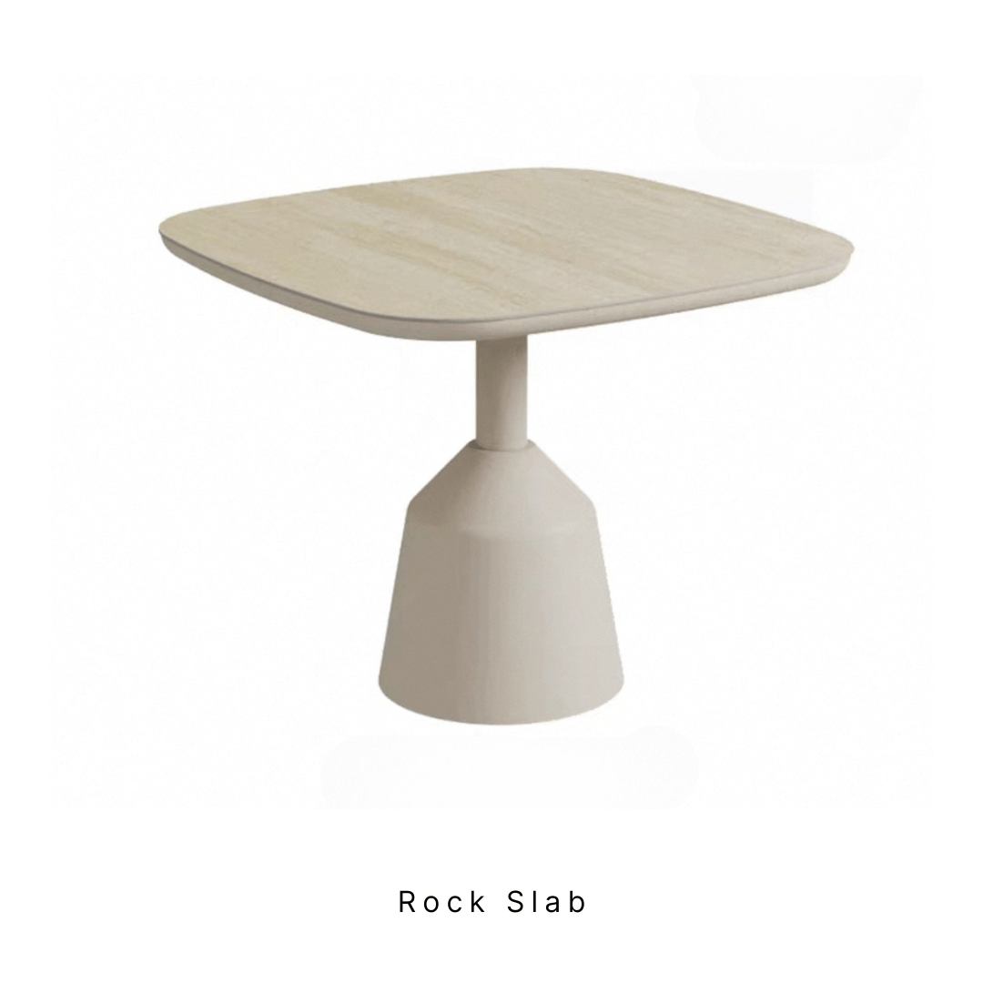 Modern Table Design: Minimalist pedestal base with a smooth stone-look surface for easy cleaning.