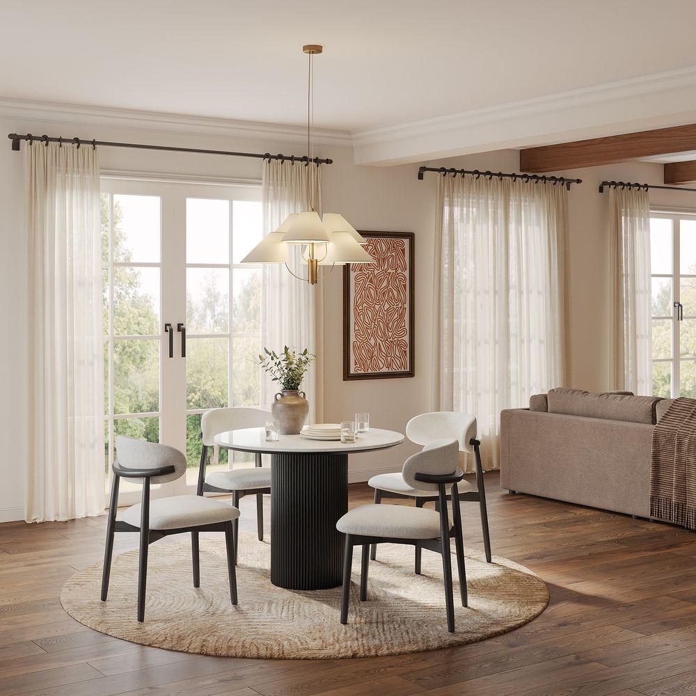The Lumea Round Dining Table captures the harmony of modern minimalism and natural warmth. Featuring a satin-finished marble top and fluted oak pedestal base, its sculptural silhouette adds understated sophistication — perfect for both intimate dinners and cozy gatherings.