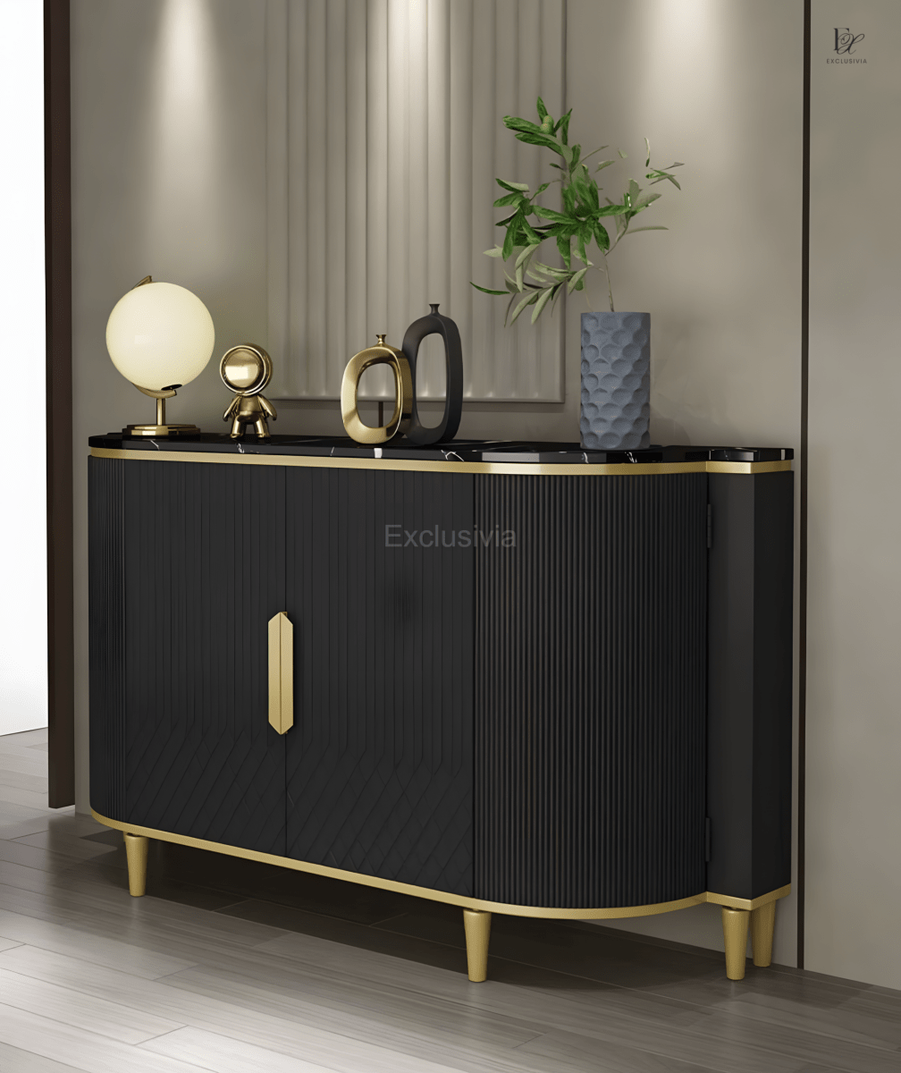 The TEMPEST Contemporary sideboard boasts an elegant and classic design with curved sides and gold stainless steel hardware. Add a touch of sophistication to any room while also enjoying ample storage space for all your belongings. Elevate your space with this sleek and stylish sideboard.
