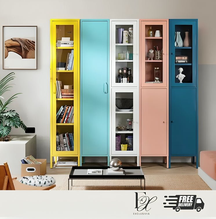 The HYAM Modern Display Cabinet Wardrobe features sleek, stylish designs with acrylic and metal doors available in blush pink, white, mint green, and daisy yellow. Made with high-quality steel and acrylic materials, this wardrobe offers durability and sophistication for any modern bedroom or closet.