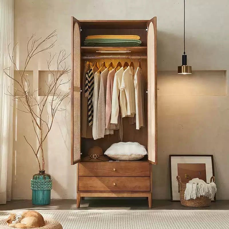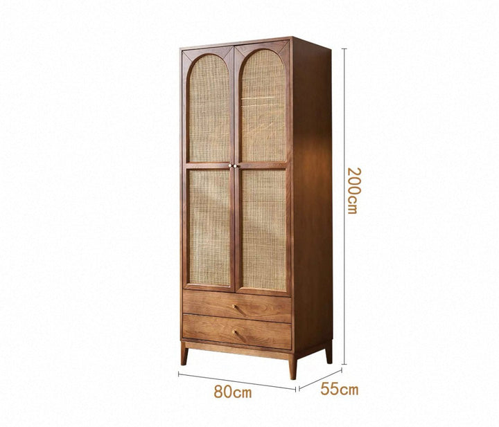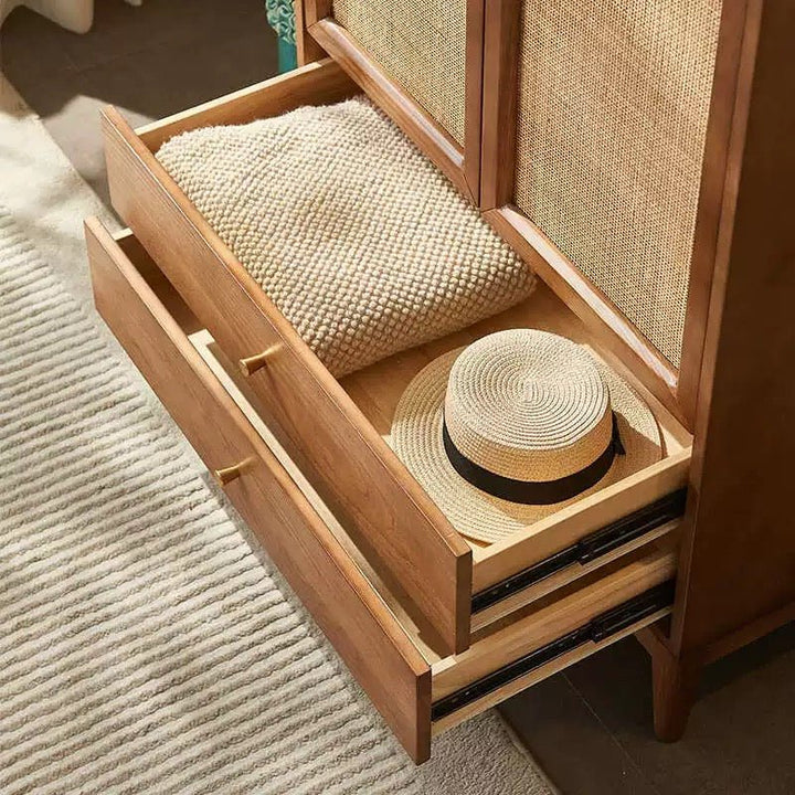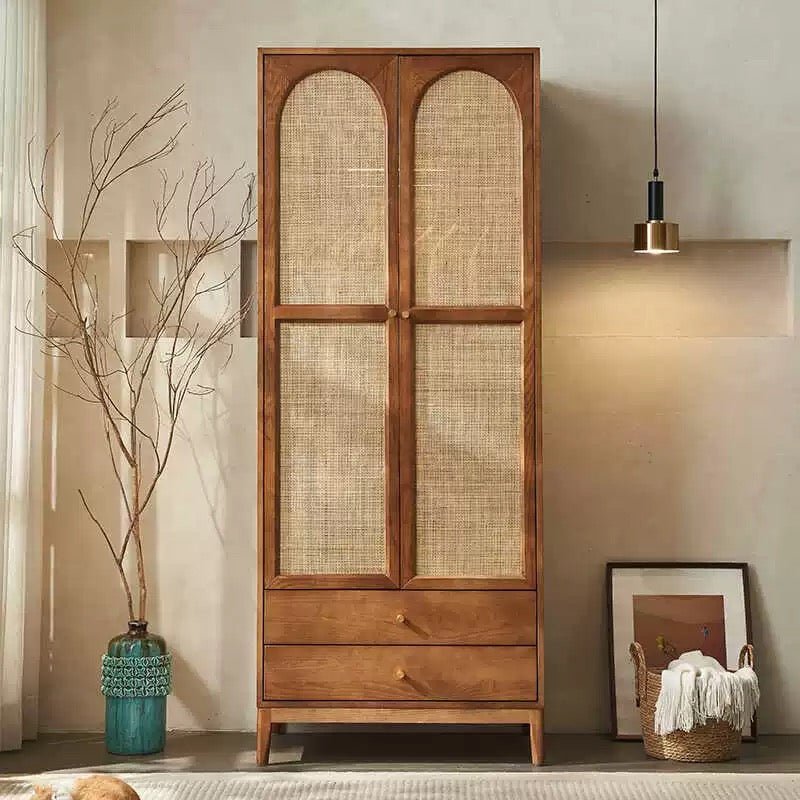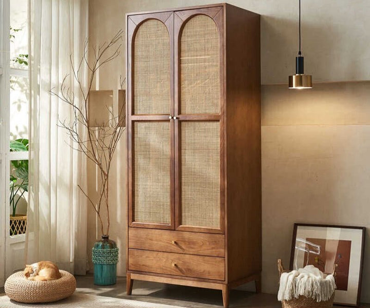 The VINTANA Nordic Rattan Wardrobe brings elegant structure to compact bedrooms. With tall arched doors, handwoven rattan panels, and smooth-glide drawers, it's a space-saving statement piece that keeps clothes organized in style.