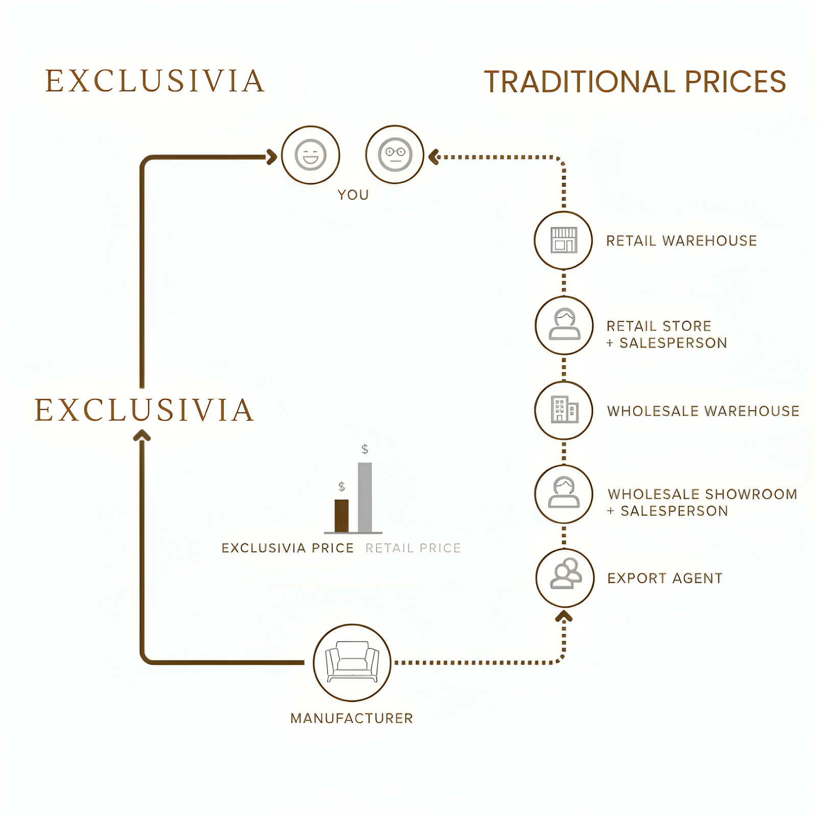 Being direct is one of our core principles. It’s how we’re able to offer thoughtfully designed furniture at genuinely exceptional value. Traditional furniture retailers often rely on multiple layers of intermediaries between production and the customer. At Exclusivia, we focus obsessively on efficiency — working closely with our manufacturing partners and selling exclusively through our own platform. By removing unnecessary middlemen, we’re able to deliver well-crafted pieces at prices that reflect their true value.